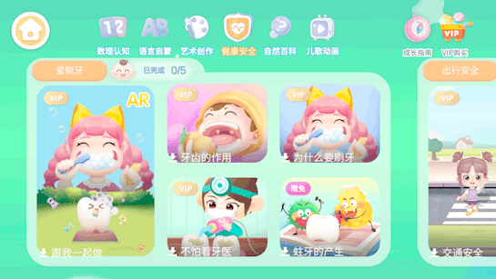 6大内容模块分别对应认字母、爱刷牙、出行安全等10多个认知主题,宝宝只要动手点一点,就能在边听、边看、边互动中,培养感知觉、注意力等认知能力。